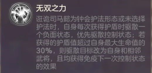 与张春华护法不同,钟会护法的诳诡司马懿和护盾的联动更多,不仅天生自带护盾额外加成,还能提高所有防御武将对护盾的利用率,提高全体防御武将的最终增减伤,给予的全队buff非常扎实。