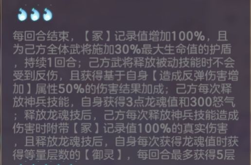 极大地提高我方防御和辅助武将的生存能力,前两回合在拥有2点及以上龙魂值时,我方盾辅将变得极其坚硬,能顺利拖入后续回合。