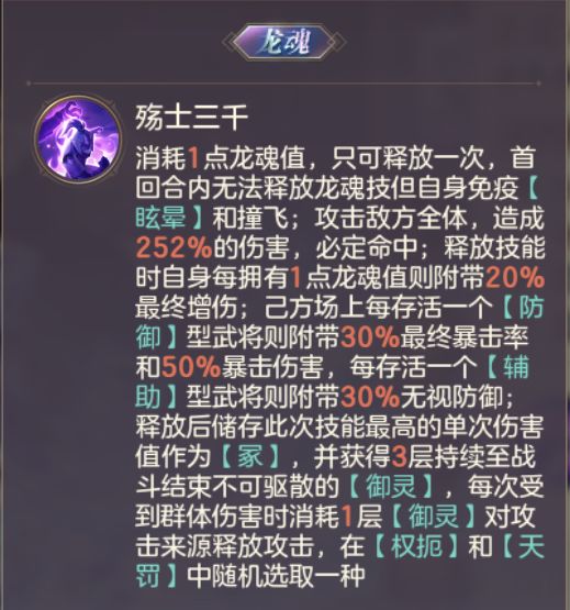 同时进一步强化龙魂技释放后的被动效果,增加防御武将(包括自身)和灵宠的伤害。对“御灵”的伤害期望也有进一步提升,在运气好的情况下能打出如下的灵魂combo: