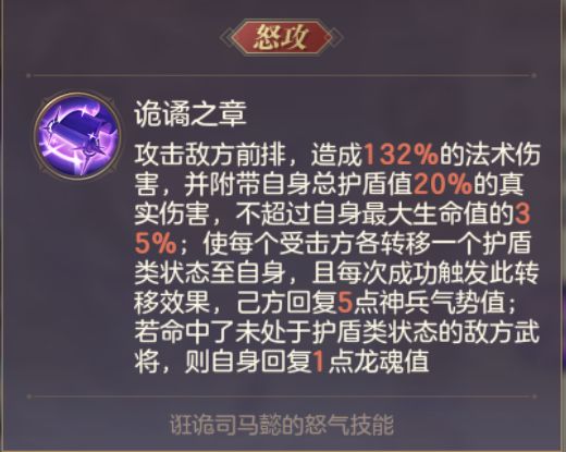 同时,护盾转移效果能此消彼长,达到削弱敌方护盾、提高我方护盾、增加怒攻伤害的三重目的,或者给自己增加龙魂值(会转换成额外伤害)。与张春华护法不同,钟会护法时和护盾的联动更高,能获得更高数值的护盾,因此对怒攻的利用率也明显更高。
