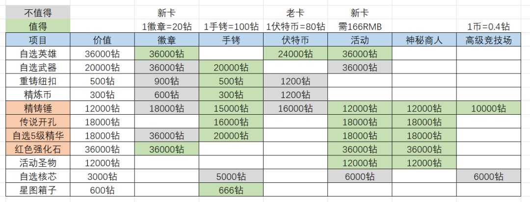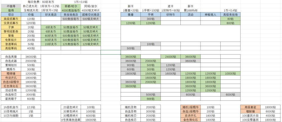 然后是部分高价值资源,该部分为了便于比较,统一用换算后的钻石价值来表示,换算方法在表头上一行的备注: