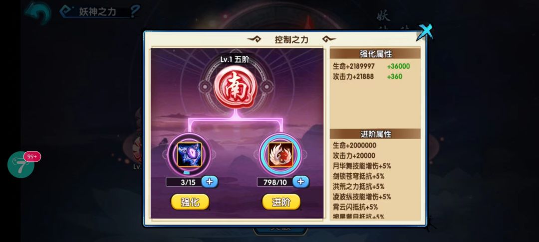 2、当所有神力的强化等级和进阶等级满(满级20级,满阶5阶),上仙即可对妖神之力进行一次突破。突破不消耗任何道具。