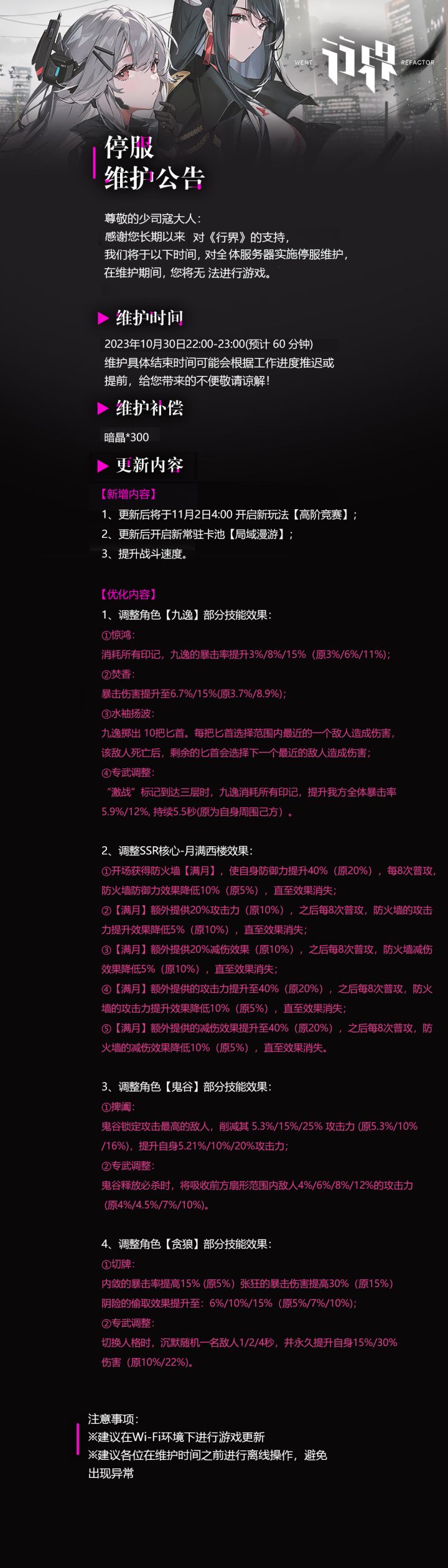 感谢您对《行界》的支持,我们将于以下时间,对全体服务器实施停服维护,在维护期间,您将无法进行游戏。
