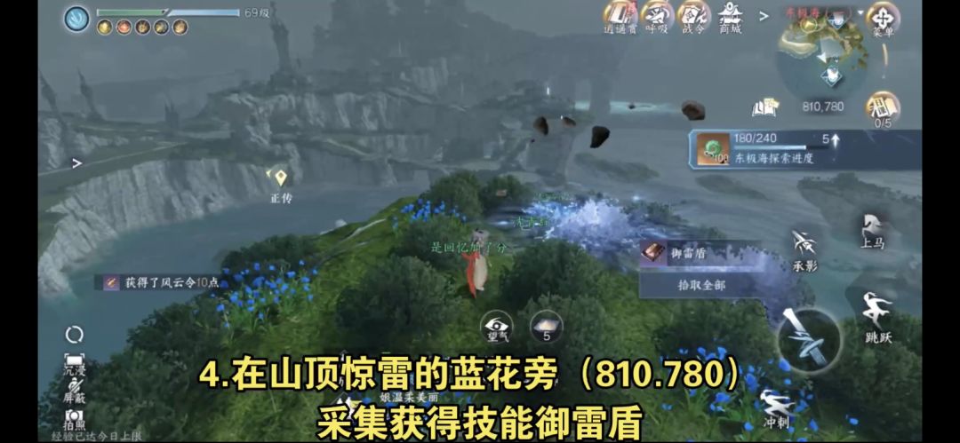 在山顶惊雷的蓝花旁(810.780)采集获得技能御雷盾