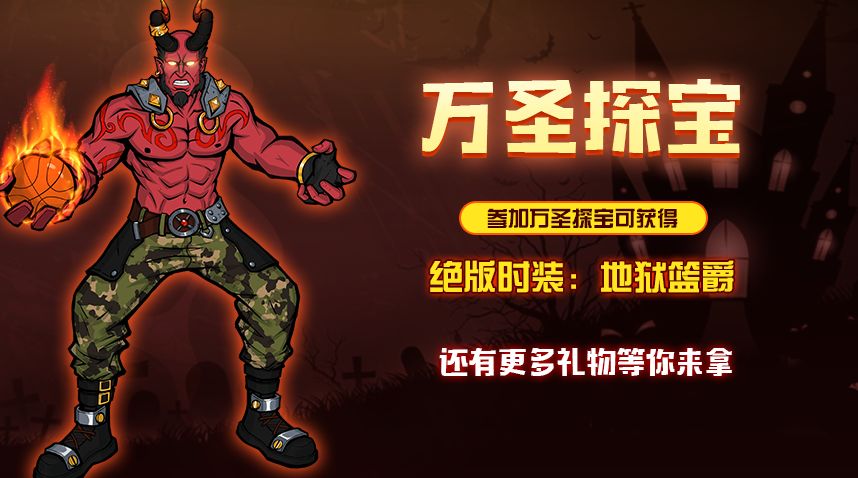 【活动介绍】万圣探宝,绝版时装等你探索!在本次活动期间,使用骷髅币可参与探宝活动,可得地狱篮爵时装、地狱篮球、恶魔之灵等节日绝版道具。做这个夜里球场最酷的仔!