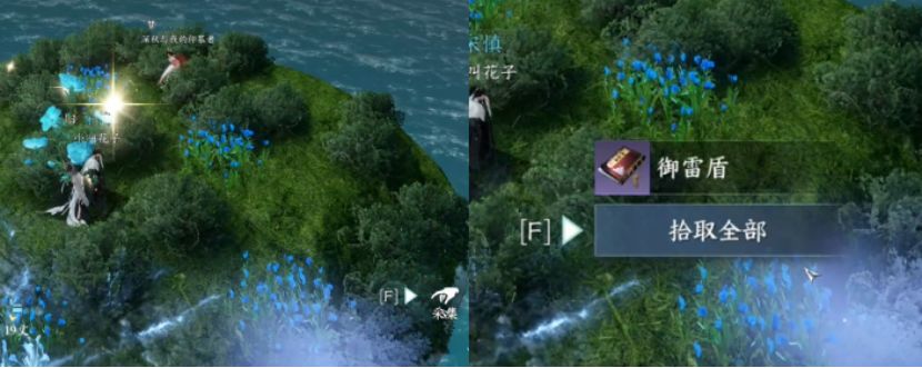 首先来到谪仙岛“810.789”处的石头最高处采集这朵花即可获得“御雷盾”