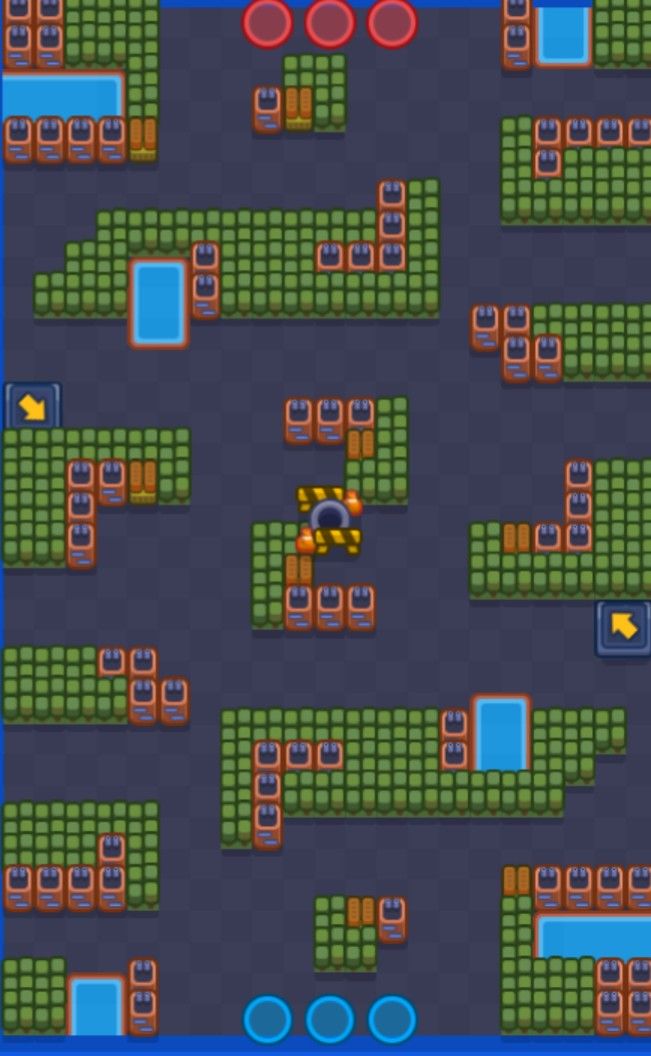 中场对应的两块掩体可以阻挡两方的正面攻击,是一个比较好的卡位点。左右两边L型草丛和墙体方便英雄做侧位打击