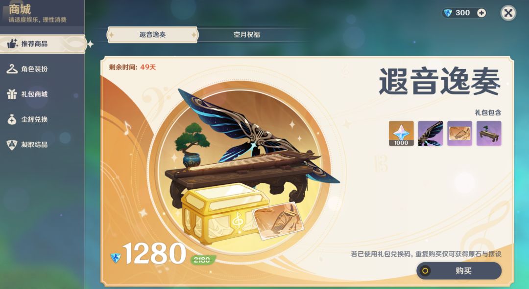 如果没有存结晶,如果是平常就有消费习惯,会氪金抽卡的玩家,直接充值128档位,再来兑换音乐包礼包的话,也就是用1280原石换来了礼包内的东西,而礼包里有1000原石,也就是相当于只是花了280原石就得到1副翅膀、一张名片和一个摆设。也挺划算的。