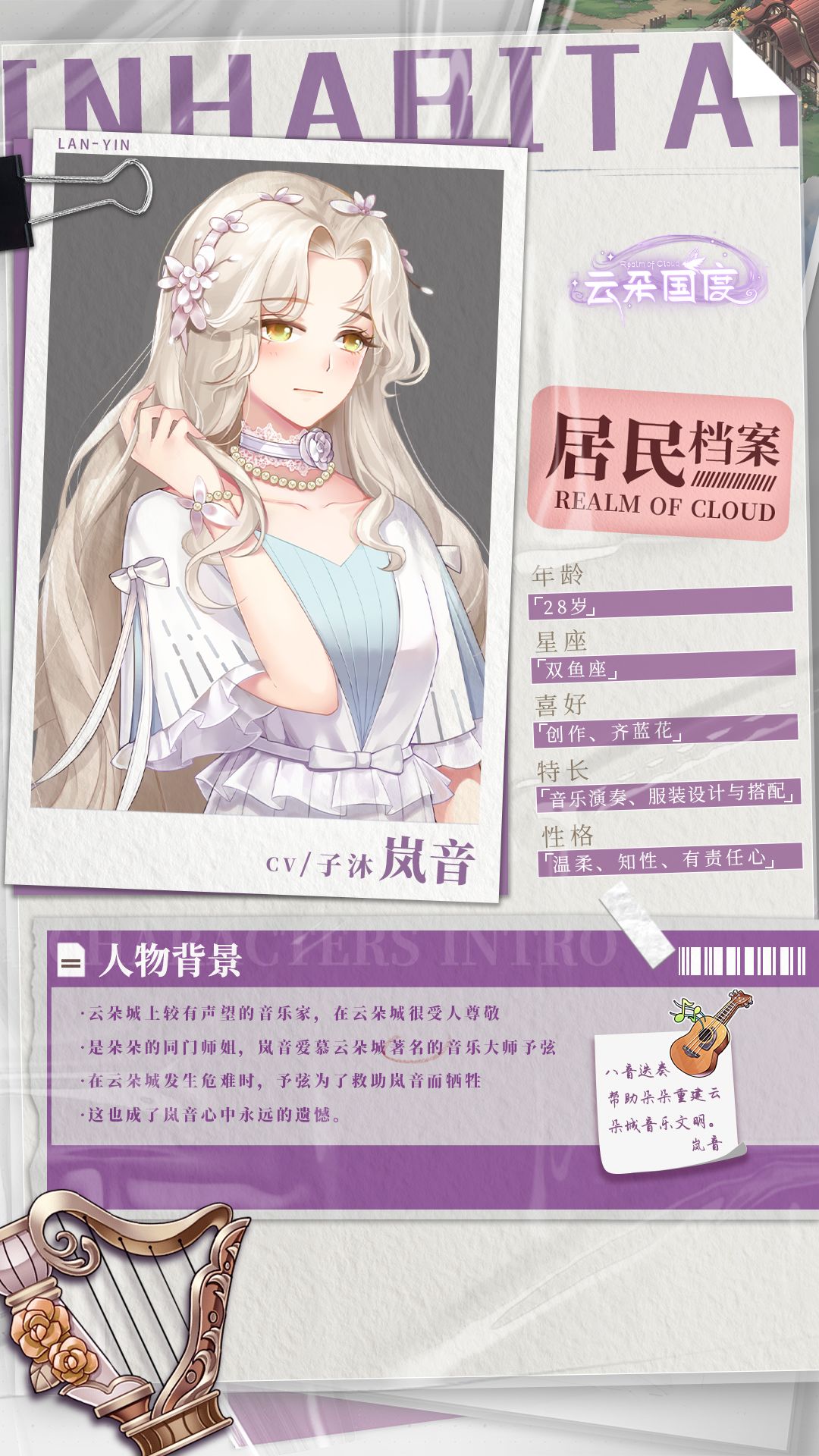 凭一席白金色波浪卷发就把优雅、知性的形象特点彰显得淋漓尽致的岚音,在弹奏箜篌上更是技艺精湛,也是云朵城注入音律的重要参与者。