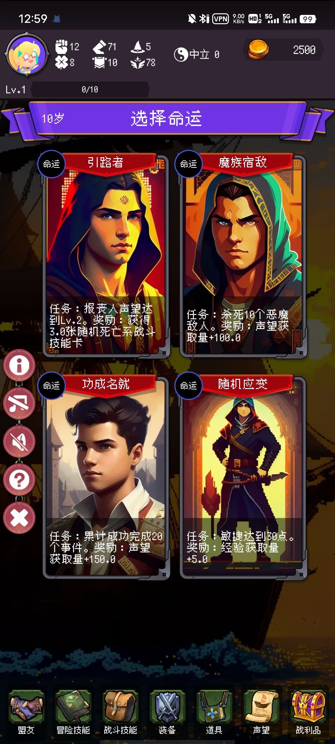 开局先拉结局把钥匙拿了先,然后第一个登场的是我们的萌新之友<剑术大师> (十把金钥匙)和<赤兔>(20把金钥匙)有这两张卡,后面随便搭配一个,建议去<吟游诗人>45岁结局<撰写新的传奇>刷<夜魔>(不需要走任何主线,45岁必出)