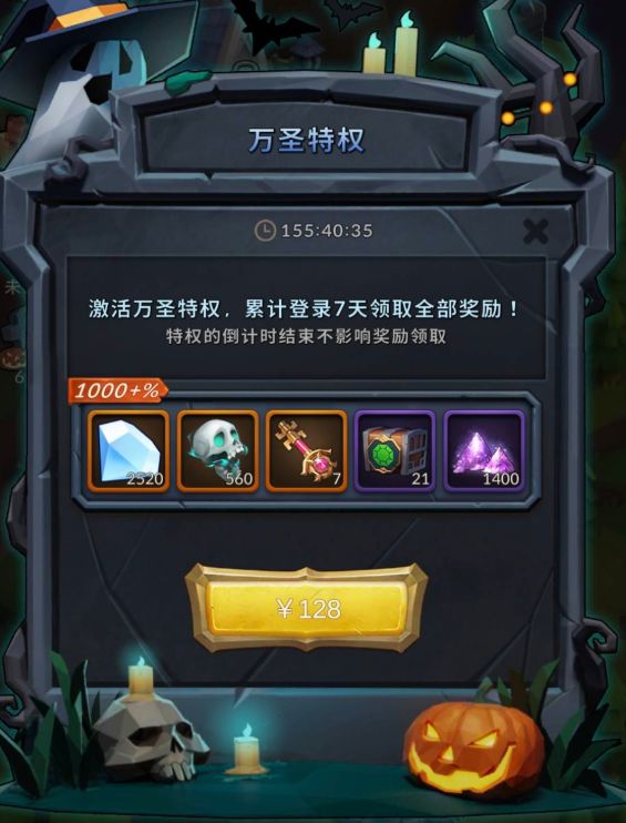 购买【万圣特权】后,活动期间每日均可领取额外的【骷髅头】💀和【命运之匙】等稀有道具。千万不要错过!