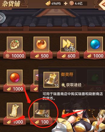 玩法道具购买入口:杂货店-御灵符(购买校武场令牌的页面)
