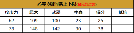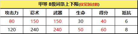 乙等:攻击, 忍术, 武器上限 预计分别为80, 150, 150