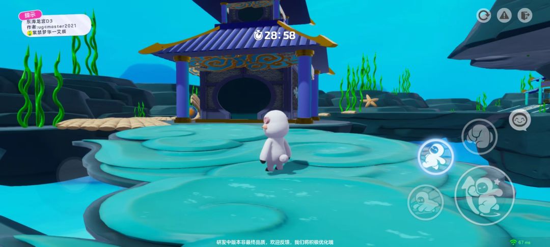 进入地图后,四周被蓝色的海水环绕,水草丰美,一座阁楼就在眼前。跳过贝壳和海星组成的障碍,最终就能抵达神话中的龙宫啦~