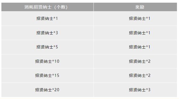 活动期间,累计消耗一定数值的「招贤纳士」将可以获得对应数量的「招贤纳士」。