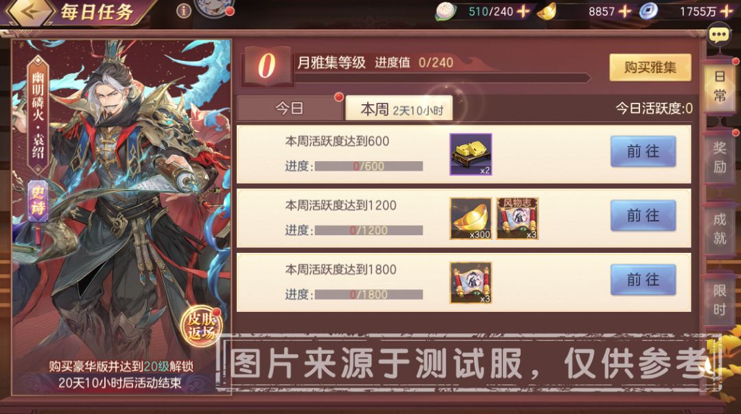 完成每日日常任务获得的活跃度将换算为月雅集进度,每获得240点月雅集进度将会提升月雅集等级,达到指定等级即可获得月雅集标准奖励。