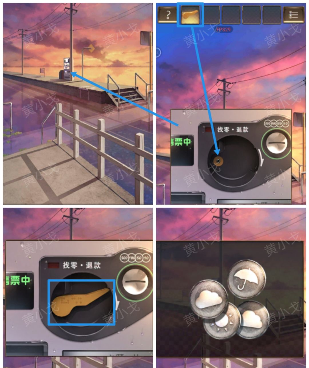 4.点击窗口上的密码锁,根据留言板上的线索,放入【伞状硬币】、【云朵硬币】、【云朵硬币】和【太阳硬币】