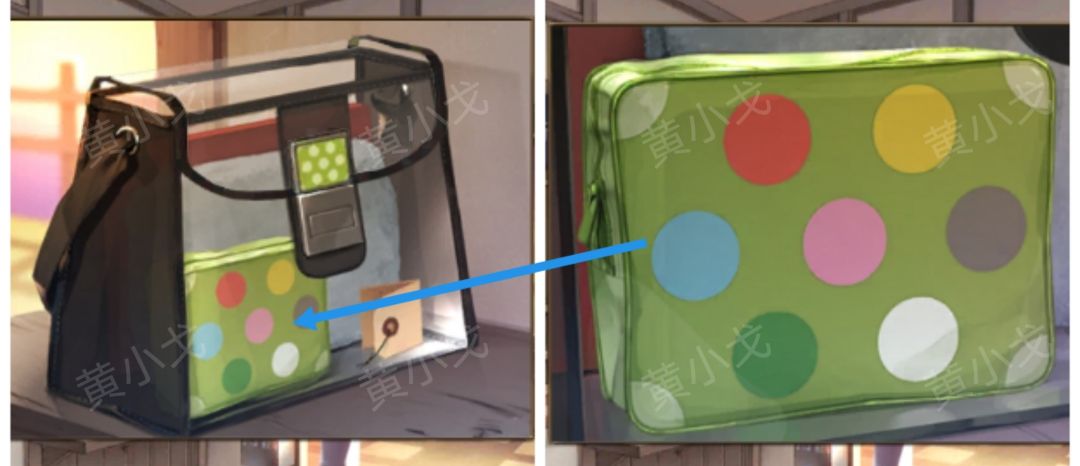 9.根据绿色小包上图案的位置和颜色(上:红黄、中:蓝粉灰、下:绿白)、【有洞的车票】上的线索(会-红色、心-黄色、大-蓝色、倒-粉色、要-灰色、滑-绿色、小-白色)和门外上的字(小心会滑倒),调整包上的密码锁(要按顺序:下右、上右、上左、下左、中中)
