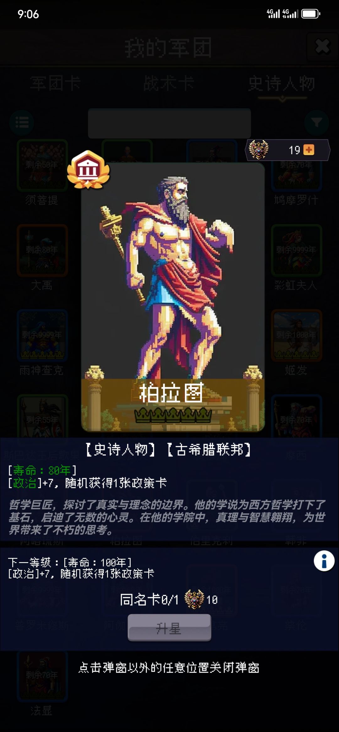 希腊卡包局内有不少可以选择的政策,如奥林匹亚竞技,局外则可以在贸易站刷出柏拉图,目前版本前三的史诗人物,一张即毕业,配合斯巴达卡包和魏、秦卡包,开局刷尚武、挟天子、军功爵,可轻松通关。
