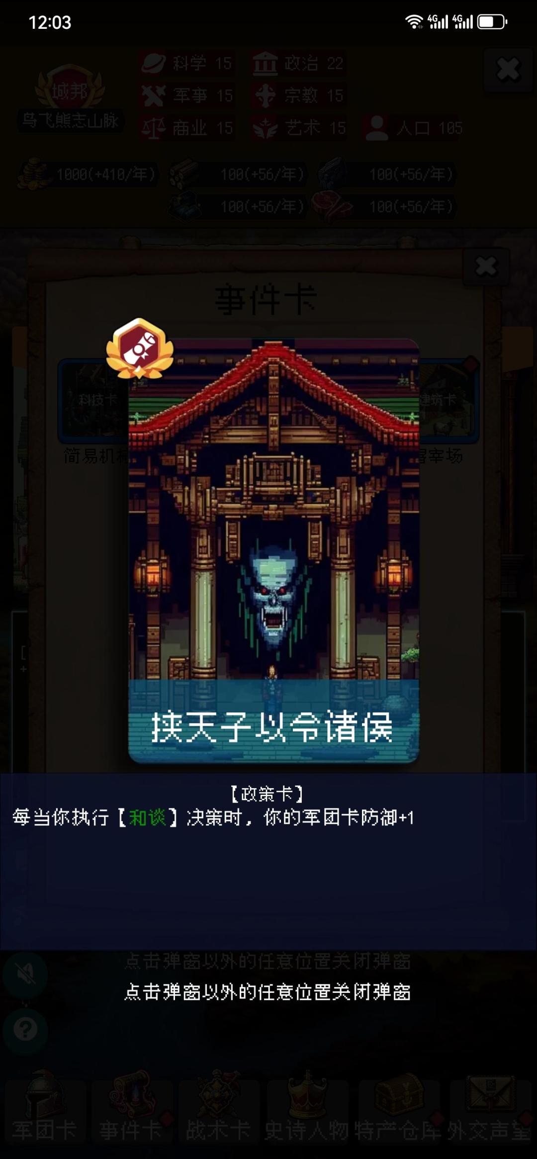 魏卡包局内可刷出政策卡挟天子以令诸侯,是能够加强全流派的政策卡,需入侵事件胜利时选择和谈,即可所有军团卡+1防御。(现有大佬研究发现,防御属性是百分比减伤,而非简单的加减,故强度优先级低于尚武)