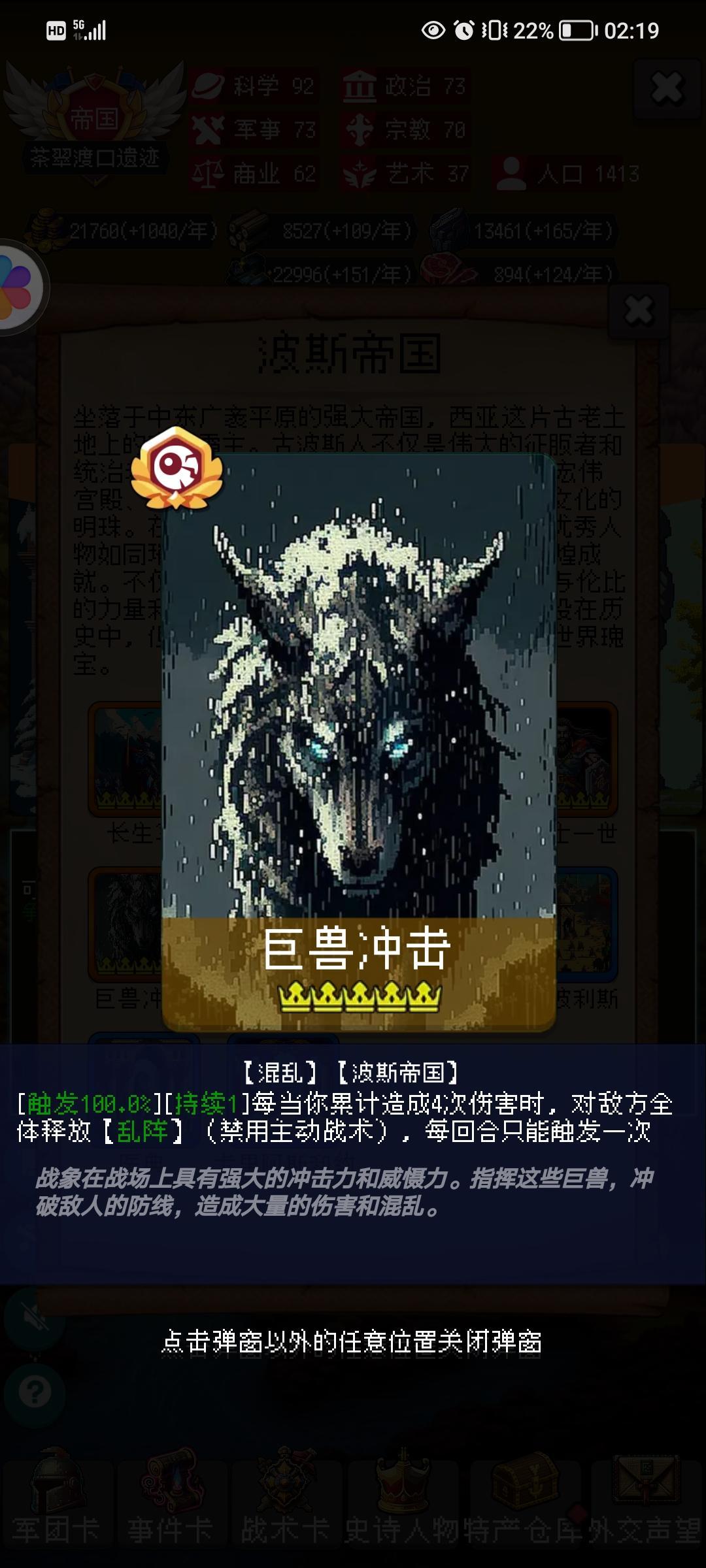 波斯卡包的政策卡、建筑卡偏向增强军团卡的生命值和器械的各项属性。军团卡波斯战象可作为器械流的主力队伍上场。且结盟征服波斯帝国会送橙卡,有一定强度。