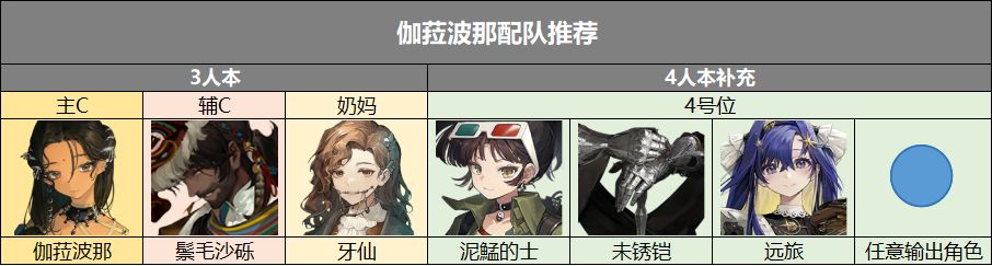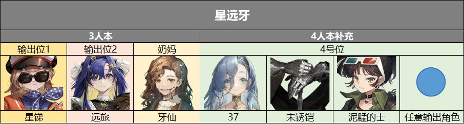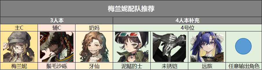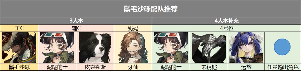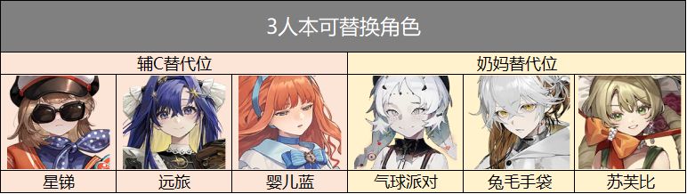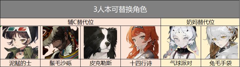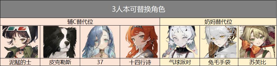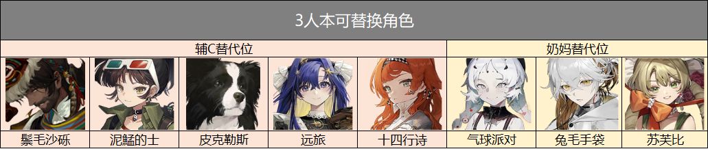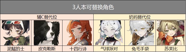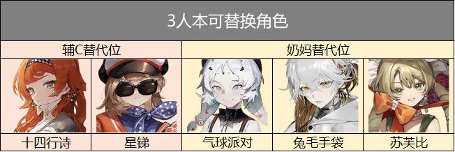 比如:无法施加【属性削弱】这类关卡debuff,那么鬃毛沙砾和柏林以东就不是最佳辅C角色,反而是皮克勒斯或泥鯭的士,十四行诗这种属性增益角色最优;所以面对不同情况还需特殊对待,不过以上配队应对绝大部分场合还是没问题的。