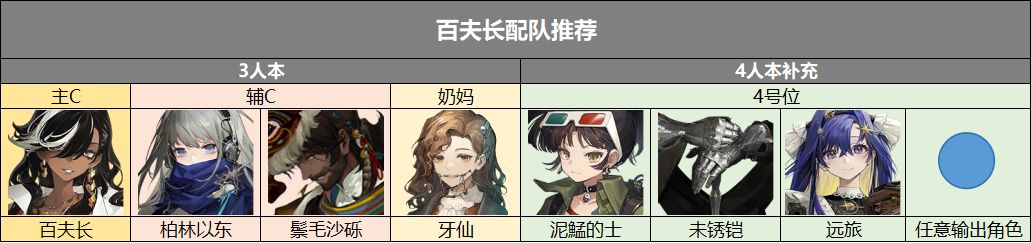 最佳配队:百夫长+柏林以东+牙仙;纯色:百夫长+鬃毛沙砾+兔毛手袋(牙仙更优)注:将百夫长替换为玛丽莲,就是玛丽莲做主C的配队推荐。