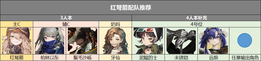 最佳配队:红弩箭+柏林以东+牙仙纯色:红弩箭+37+牙仙注:将红弩箭替换为金蜜儿,就是金蜜儿作为主C的配队推荐