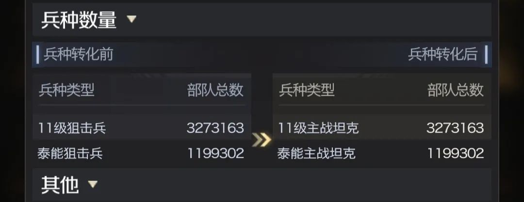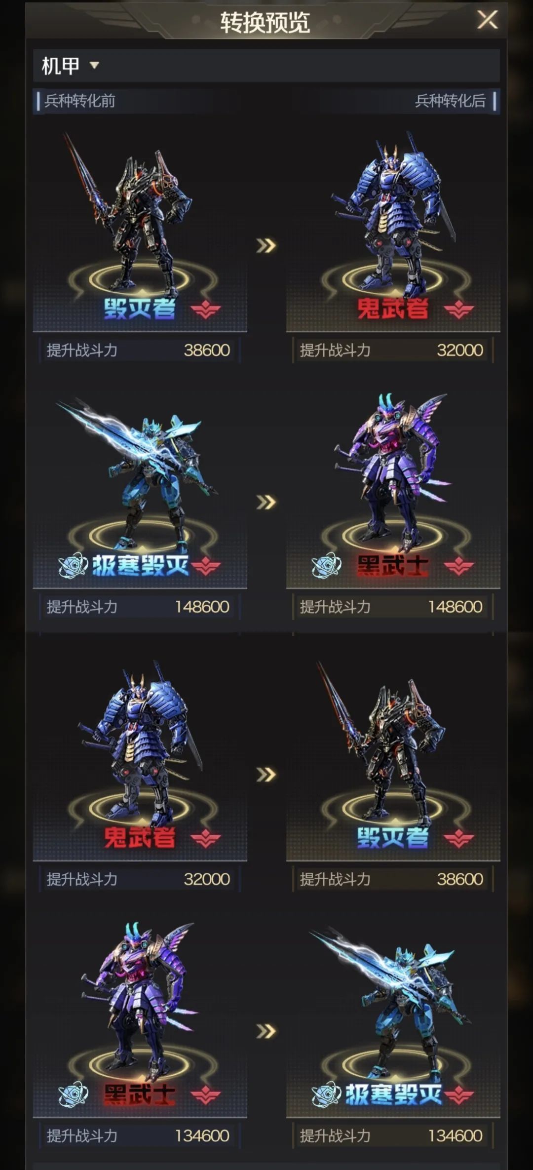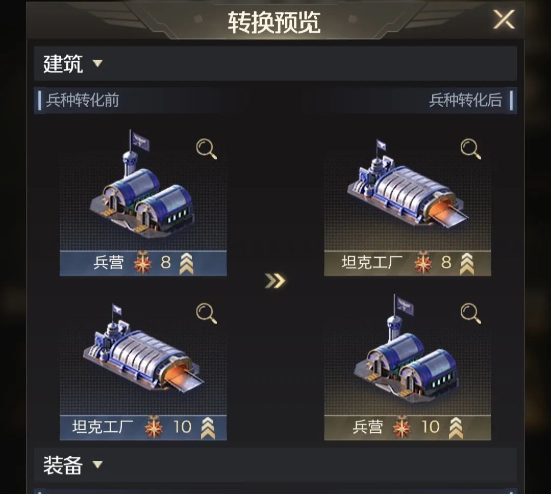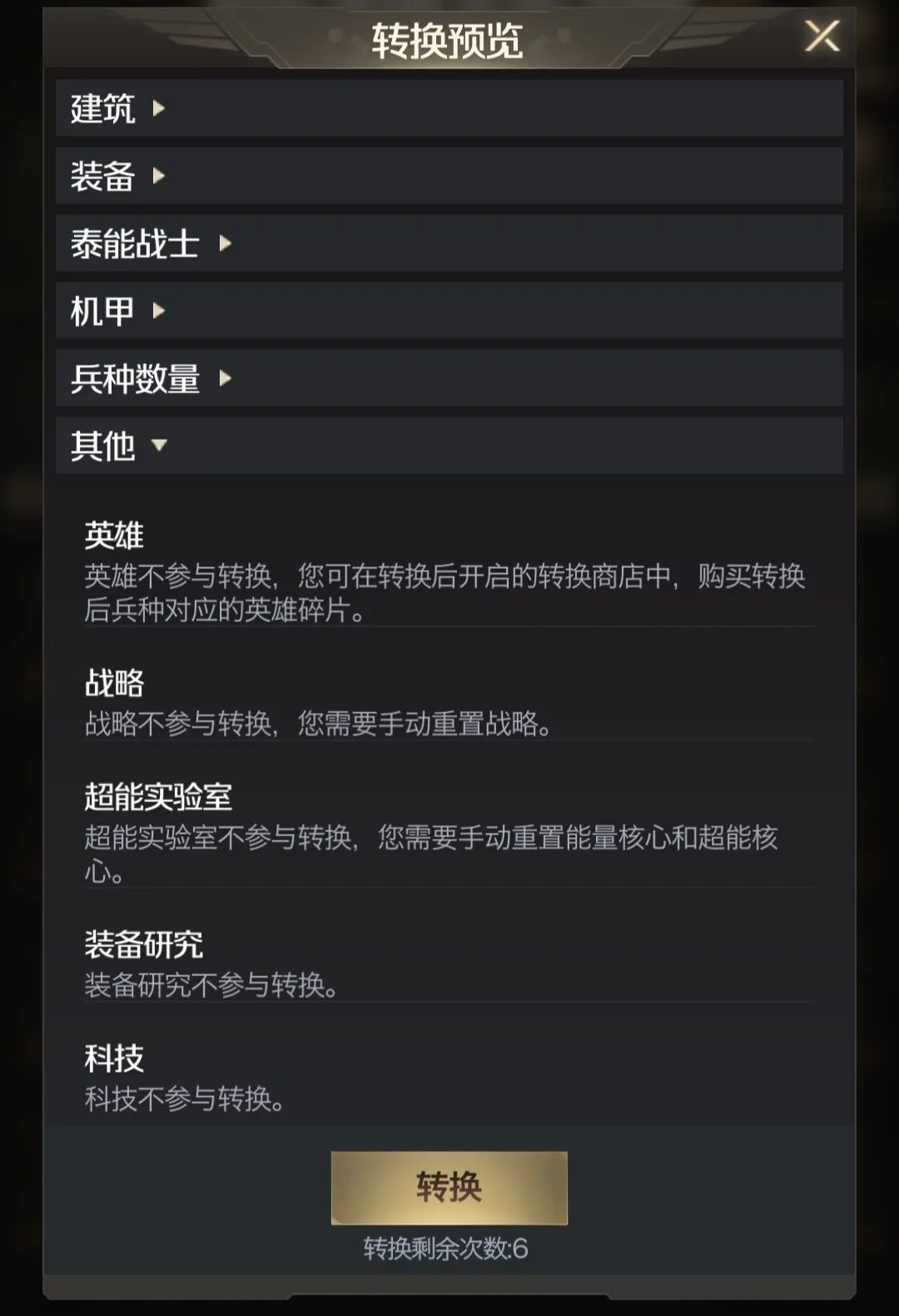 在转换信息预览界面可对比兵种转换前后的各类数据变化:建筑、装备、机甲、泰能战士、士兵数量等,上面介绍活动的时候给大家展示过了不再赘述!