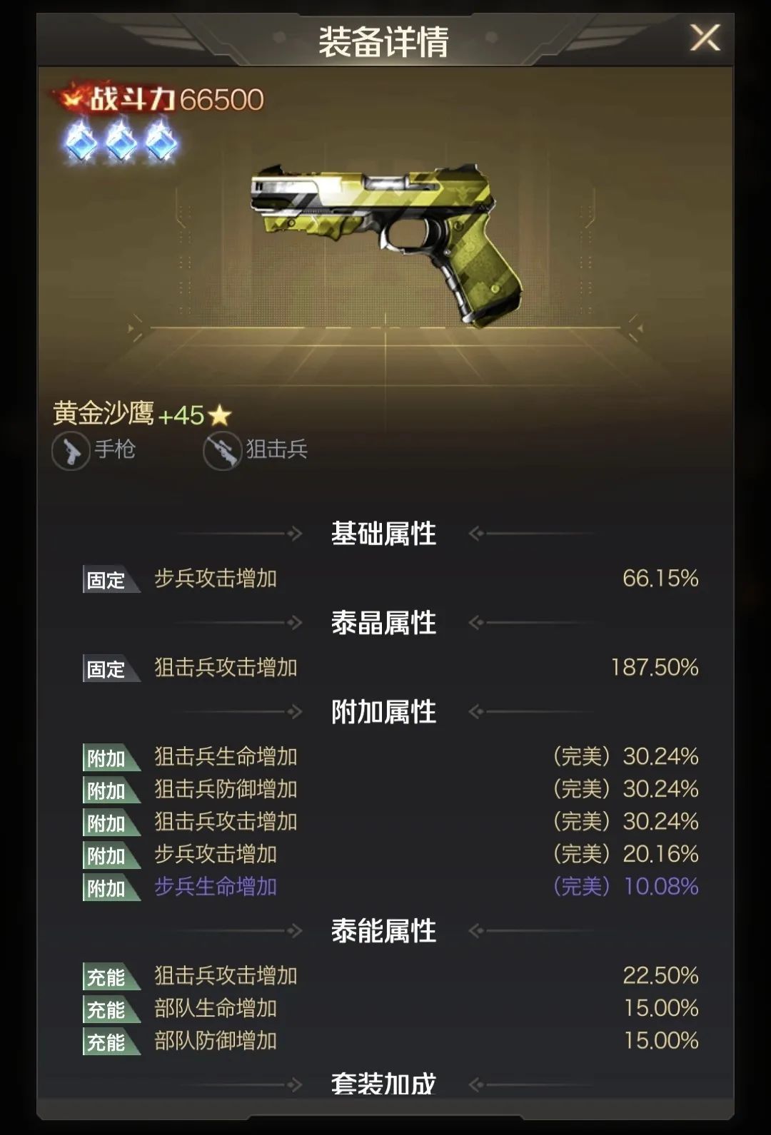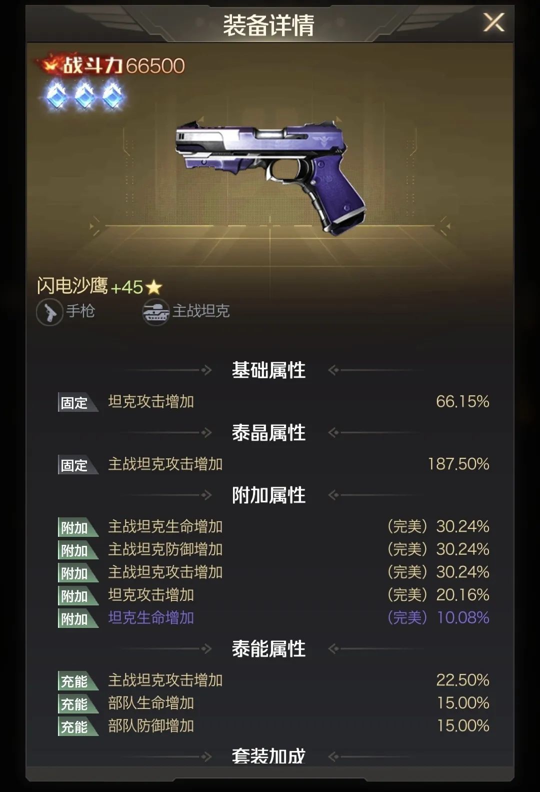 替换过程不改变装备的品质、等级,泰晶;非专属词条如部队生命/攻击/防御 ,不做处理,专属词条如XX兵种生命/攻击/防御,替换词条类型,不替换数值;若原装备上存在目标兵种的词条,也将进行互换。如:轰炸机转主战坦克,轰炸机装备上存在轰炸机攻击+10%,主站坦克攻击+5%,转换完后变为主站坦克攻击+10%,轰炸机攻击+5%。以小编狙击兵转主战坦克的手枪部位为例,图示如下: