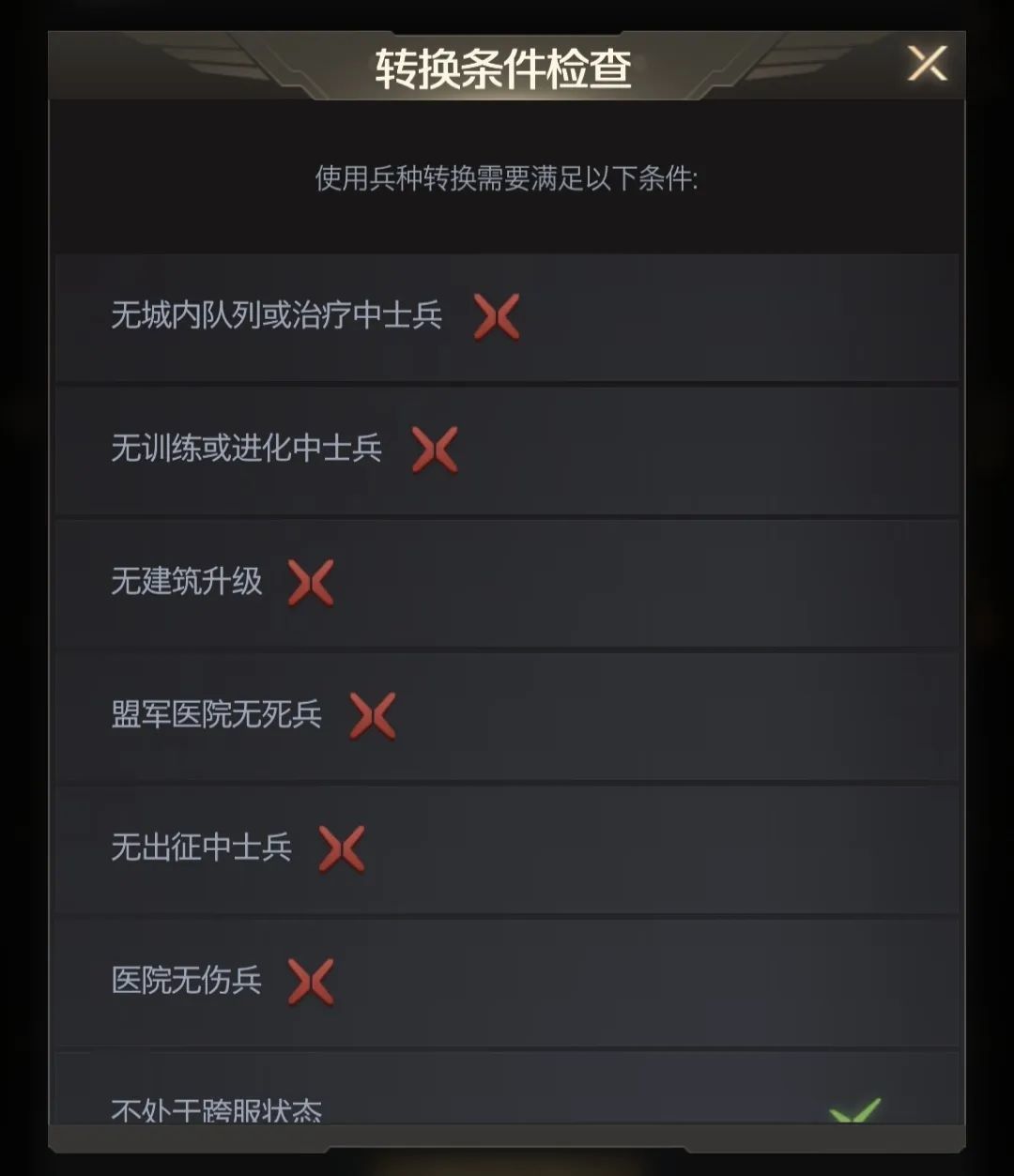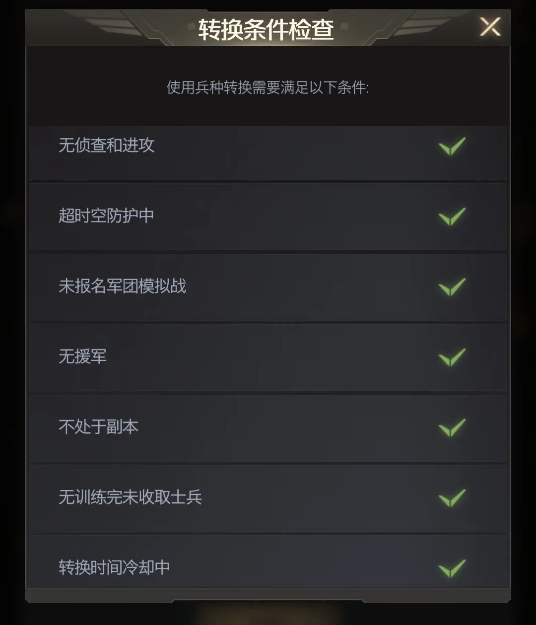 使用兵种转换功能, 指挥官不可处于建筑升级 ,科技升级或装备研究升级的状态中;当前所有部队不处于侦察 ,出征 ,驻扎 ,采集 ,造兵 ,泰能进化 ,援助 ,被援助 ,被侦察 ,被进攻 ,跨服 ,副本 ,防空洞 ,医院 ,攻防模拟战 ,军团模拟战的状态中。如图所示,是否满足转换条件会有提示: