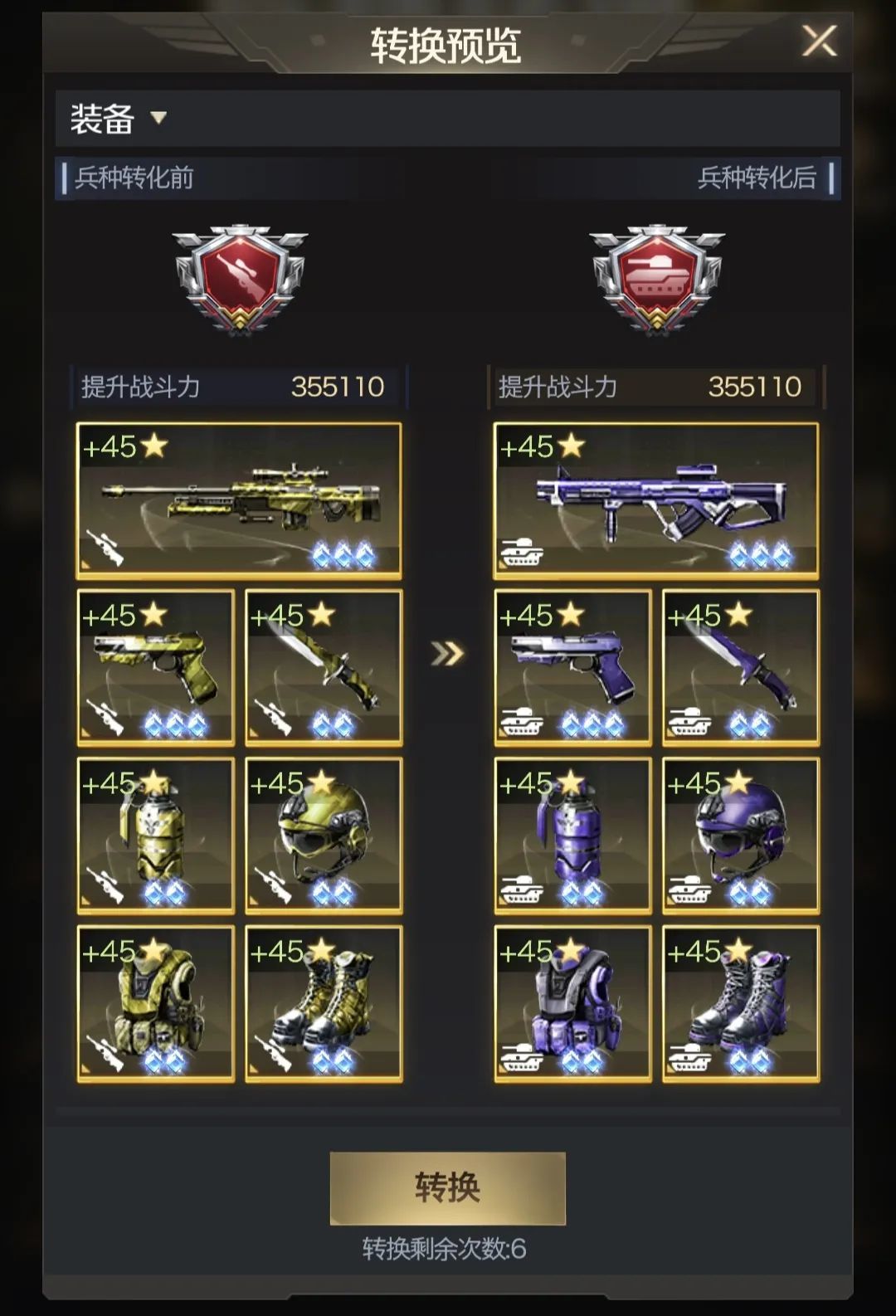 2、装备的变化采用替换规则:A兵种的装备替换为B兵种的装备。根据大家所选择的原兵种类型,从已有的套装中,选择符合该兵种类型的一套最高战力的装备进行转换,其余装备都不做处理。