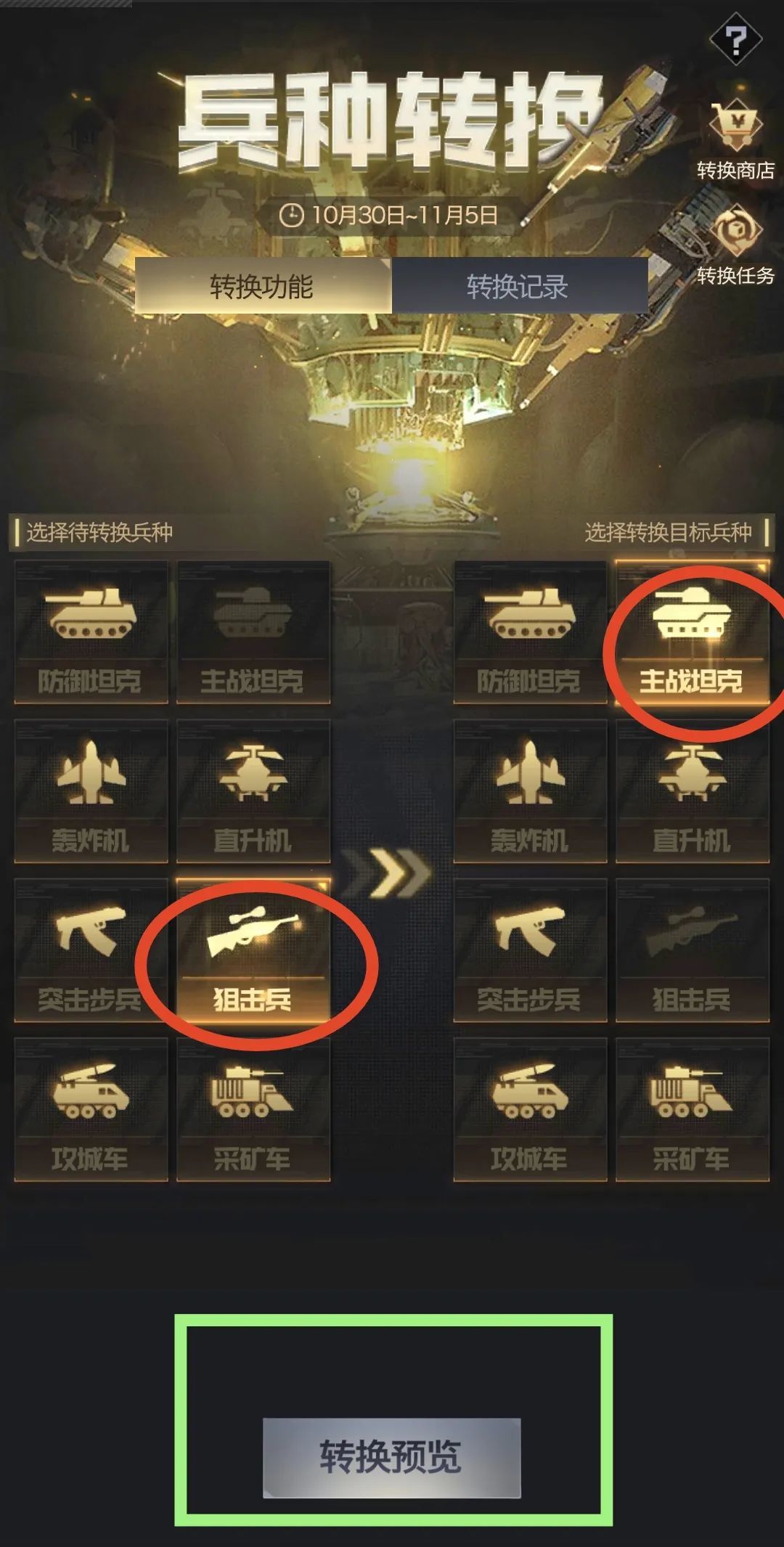 界面左右两侧展示八兵种的图标和名称,大家可在左侧选择被转换兵种,在右侧选择转换的目标兵种,选择完成后可点击【转换预览】查看转换相关的所有信息。以狙击兵种转换主站坦克兵种为例,图示如下: