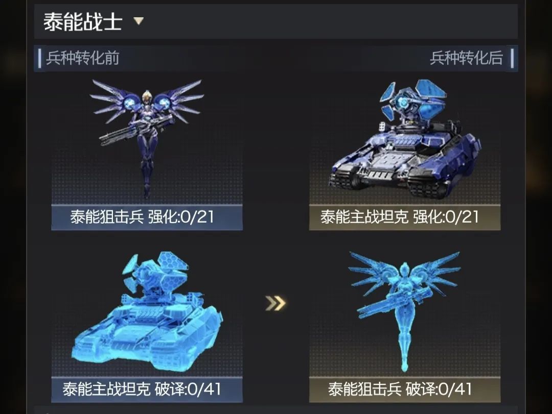 4、泰能战士的变化采用对调规则:A兵种的泰能战士和B兵种的泰能战士养成情况完全对调 ,包括解锁状态。