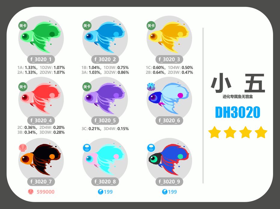 小五是豆花族4星鱼,一共9种颜色,其中前5色出处在关卡,第6色只有在进化中出现,第7色是贝壳,第8、9色是珍珠,活动将在11月1日中午上线,下线时间为11月20日。
