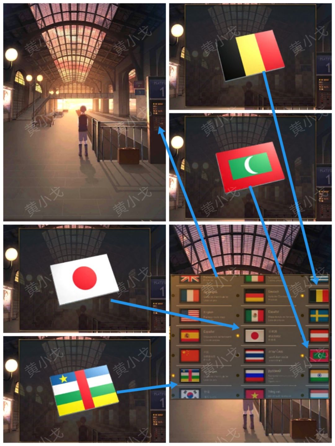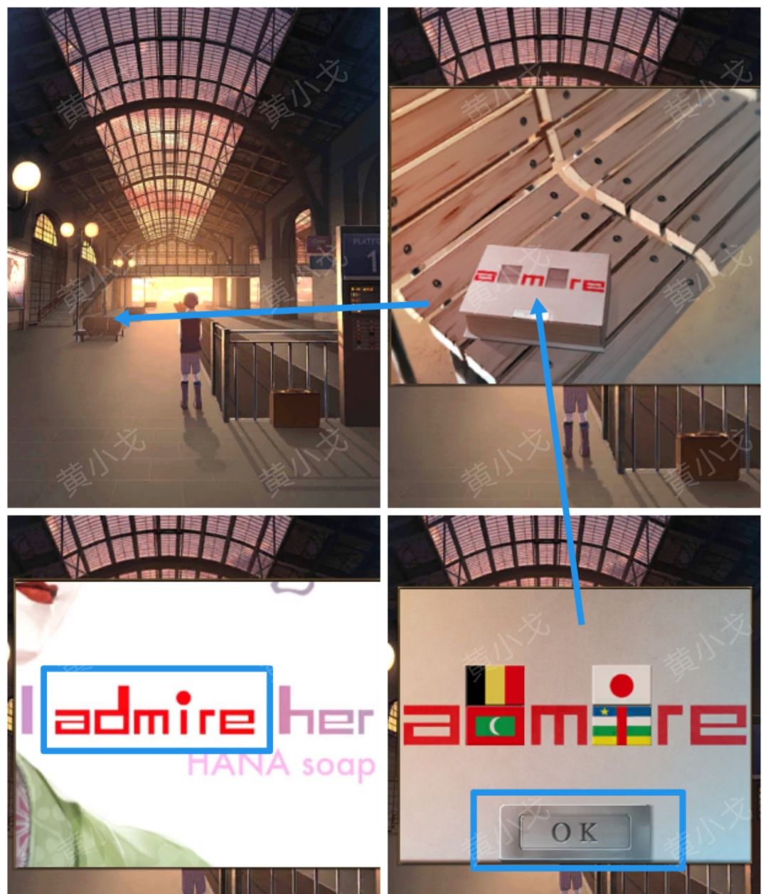 4.点击椅子上的盒子,根据广告牌上的线索,放入四个【零件】,使其组成:admire(左边:德国🇩🇪在上,马尔代夫🇲🇻在下、右边:日本🇯🇵在上,中非在下)