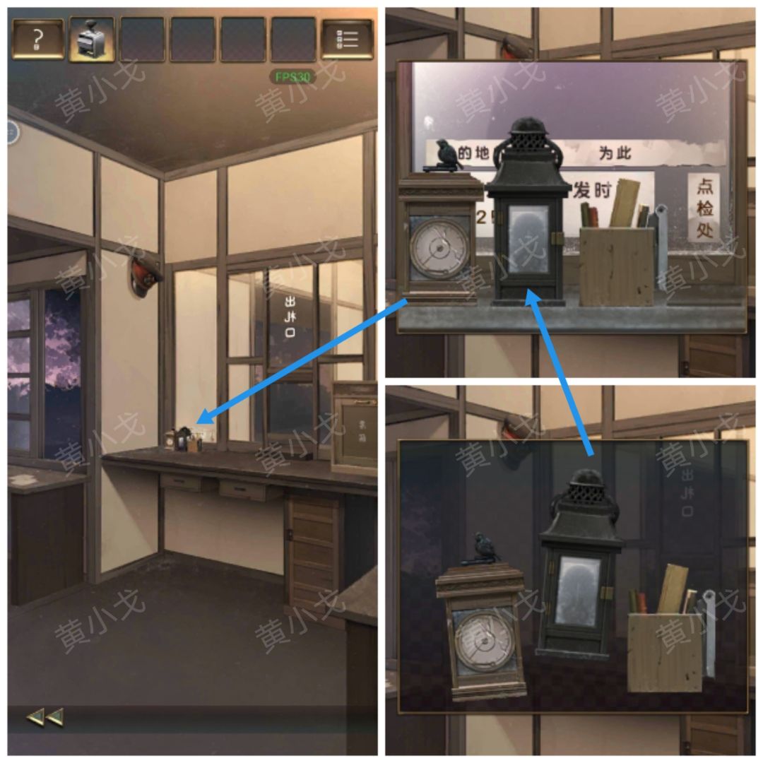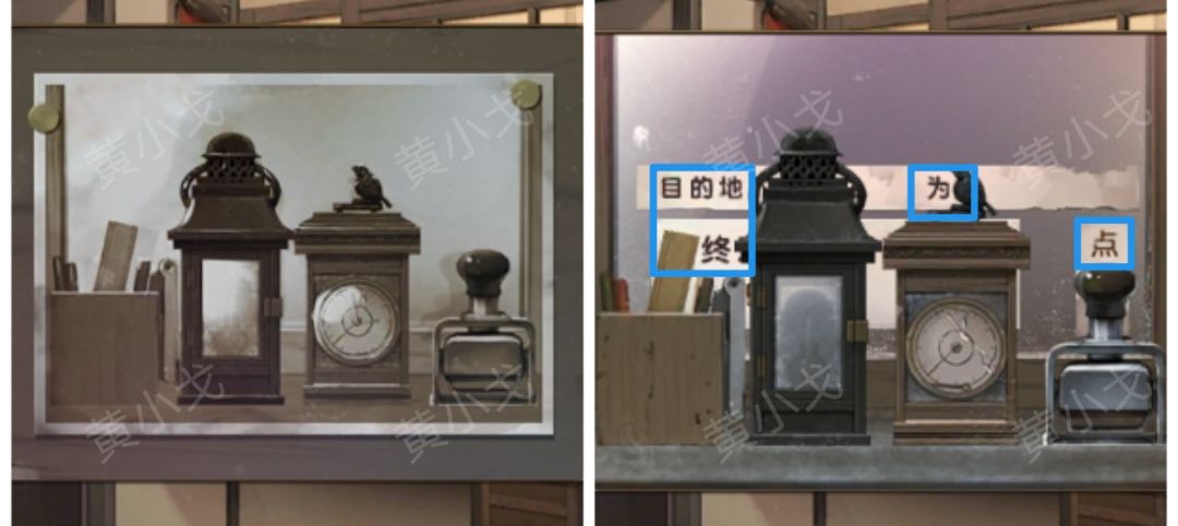 7.根据柜门上的照片上的物品摆放位置,将【笔筒】、【灯】、【时钟】和【印章】摆放的正确的位置上,获得线索:目的地为终点