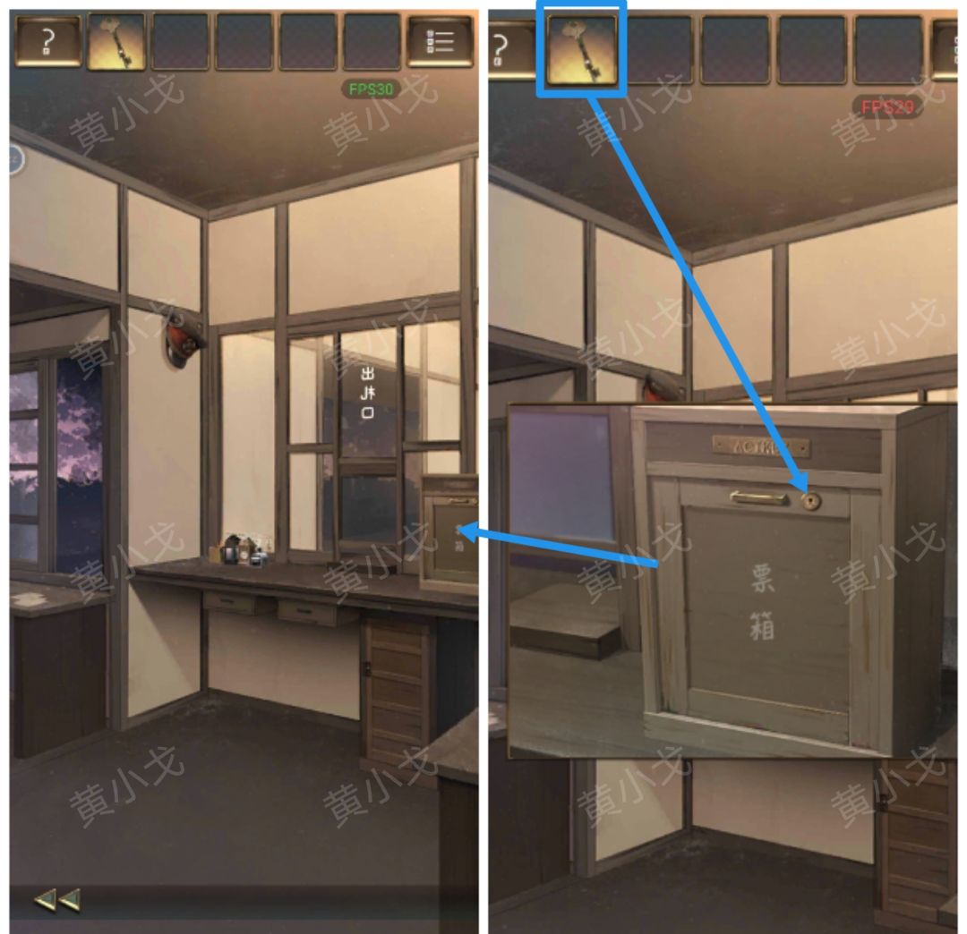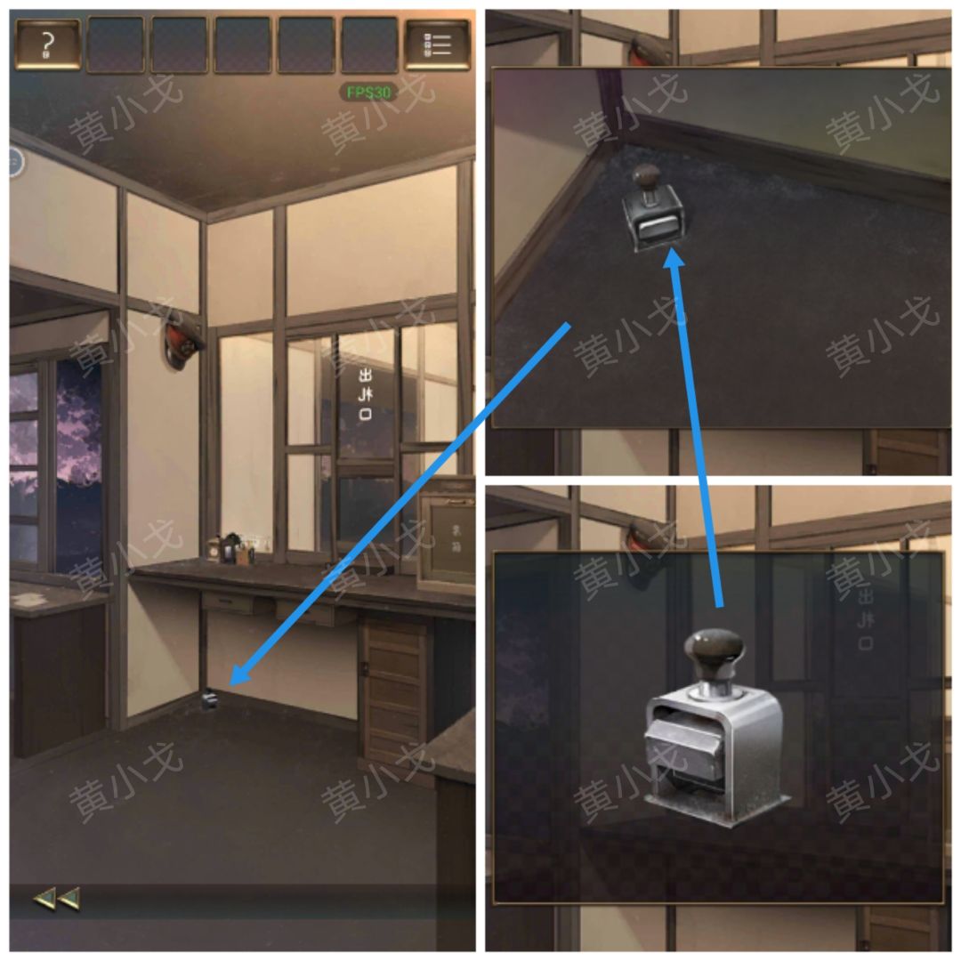 5.柜子打开,获得【扫帚】;查看贴在柜门上的照片,获得线索(物品位置:笔筒、灯、时钟和印章)