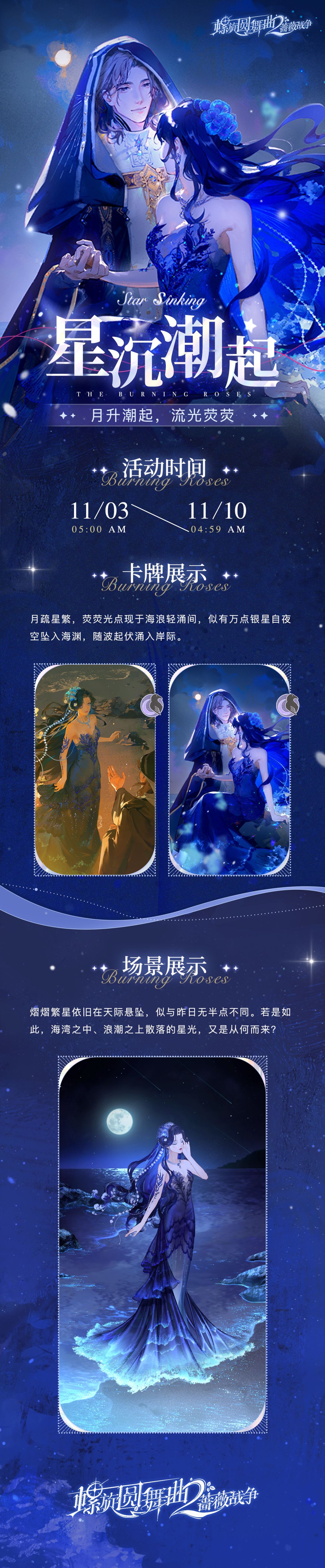11月3日5:00-11月10日4:59,点击主界面「抽奖」进入「月汐海岸」奖池,使用「海贝」抽取活动限定套装【海潮荧荧】、限定卡牌【星海眷赐】。