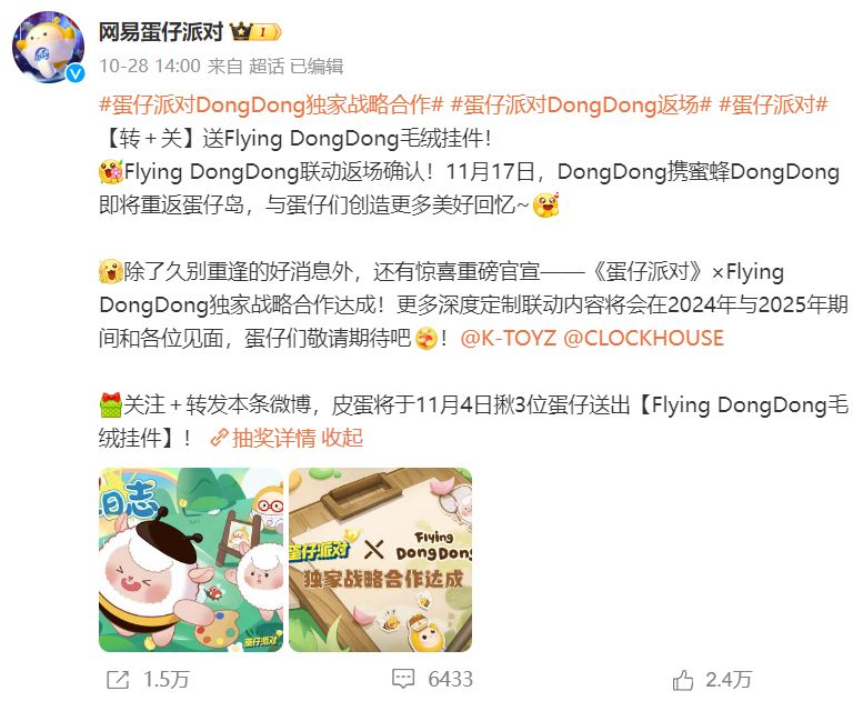 10月28日,网易《蛋仔派对》开启DongDong羊IP的联动返场,并宣布独家战略合作达成。此消息一出,《蛋仔派对》迅速登上热搜榜第5名,可见玩家对此IP返场活动的狂热。