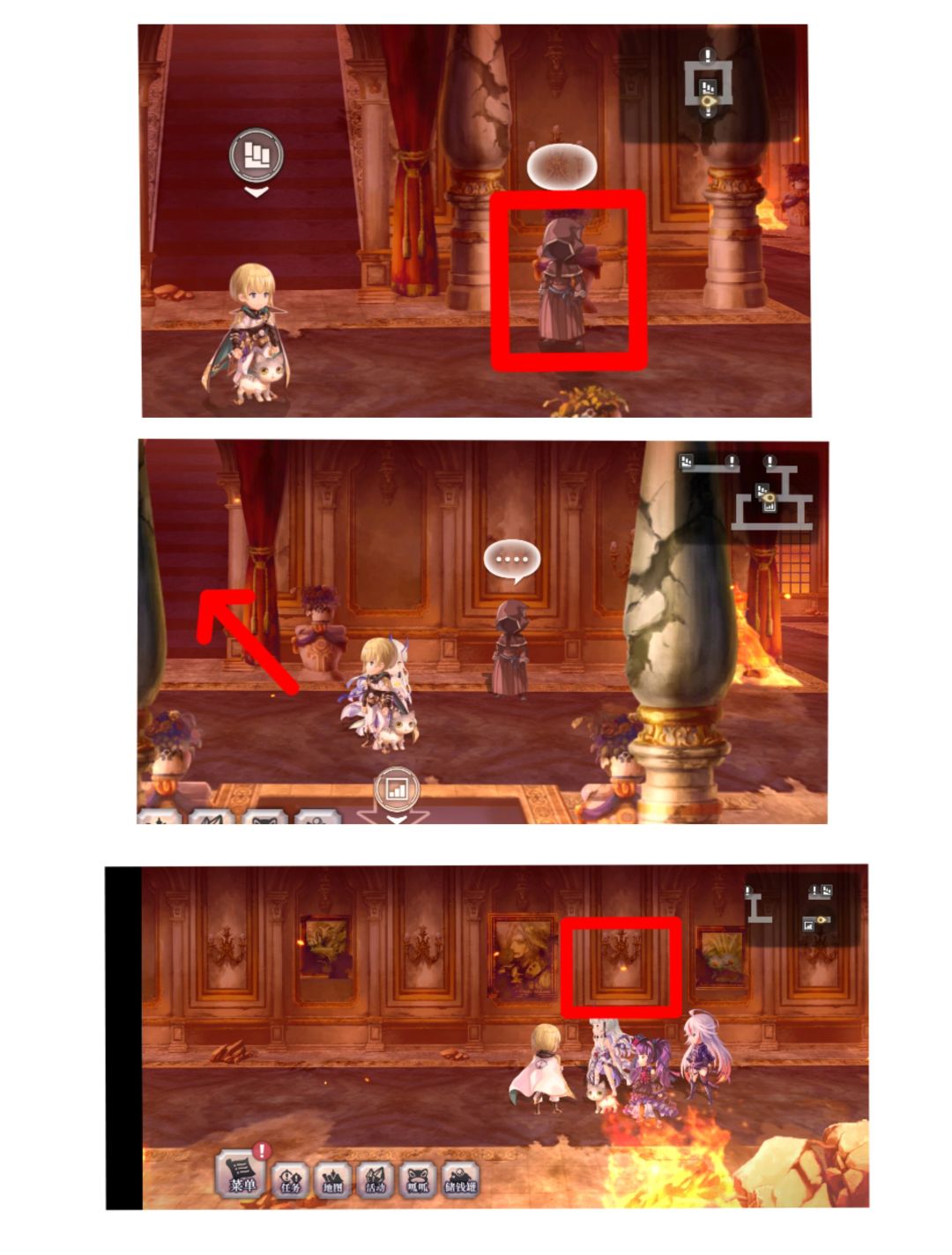 ①任务4:从幽灵古堡一路下到3楼西侧,图二位置进去打开开关,然后图三点击第二个骑士,然后进洞