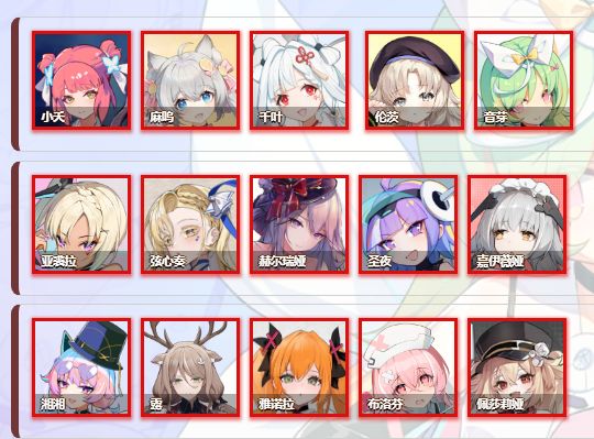 首先看上图,左侧都有3个角色单独列出来,这是我认为的绑定在一起的最好的搭配(有一个角色例外会在后边提到),然后分别从3个角色出发从右边选择剩下的角色补充。()