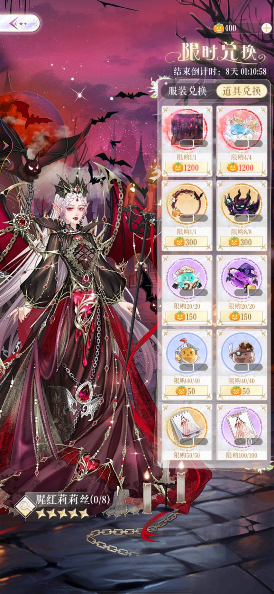 腥红莉莉丝服装套7000南瓜灯,妆容1000,背景1200南瓜灯,全部拿满9200南瓜灯,不拿妆容猩红莉莉丝依然是套装。