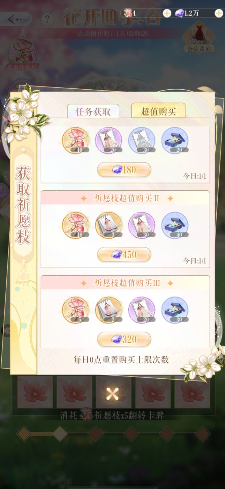 限时七日 翻牌,5祈愿枝翻一次,一层20抽保底,一共六层,需抽到本层服饰才能开启下一层