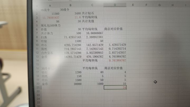 30元周礼包250体力,以7体力一关开始为例共计扫荡35.7次得750经验,2142.8符石,107.1图纸,216白色宝石(加上宝石的换算,只中白色和绿色,没有计算蓝色和以上的)7142.7金币。每块钱相当于游戏价值9.76元。但是这里面有个最重要的物资没办法换算,经验。如果你是在游戏前期技能还没解锁完和还没有仆从的情况下,这是优先购买项。因为他能更快的把整个游戏展示给你。