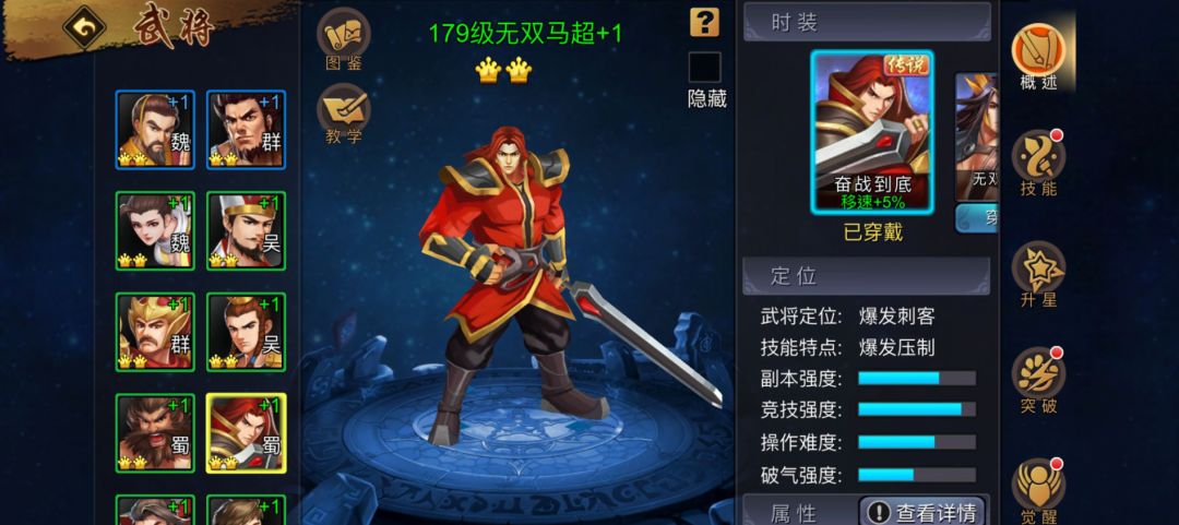 进入游戏打开界面在人物概述中观察武将的定位后可以发现系统对武将的定位和技能特点进行描述,无双马超被定义为爆发刺客,技能特点是爆发压制,这样看来无双马超其擅长连击与技能,因此排位的时候我们一定要利用无双马超的优点来克制对手。所以排位首要便是了解自身优点与缺点,为最终的胜利打好基础。