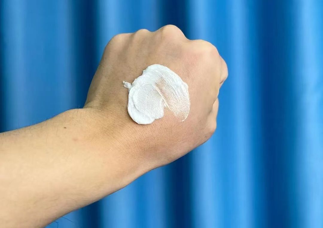 白色乳状质地,没有流动性,质地顺滑,推开没有拉丝感,也没有颗粒磨砂感。