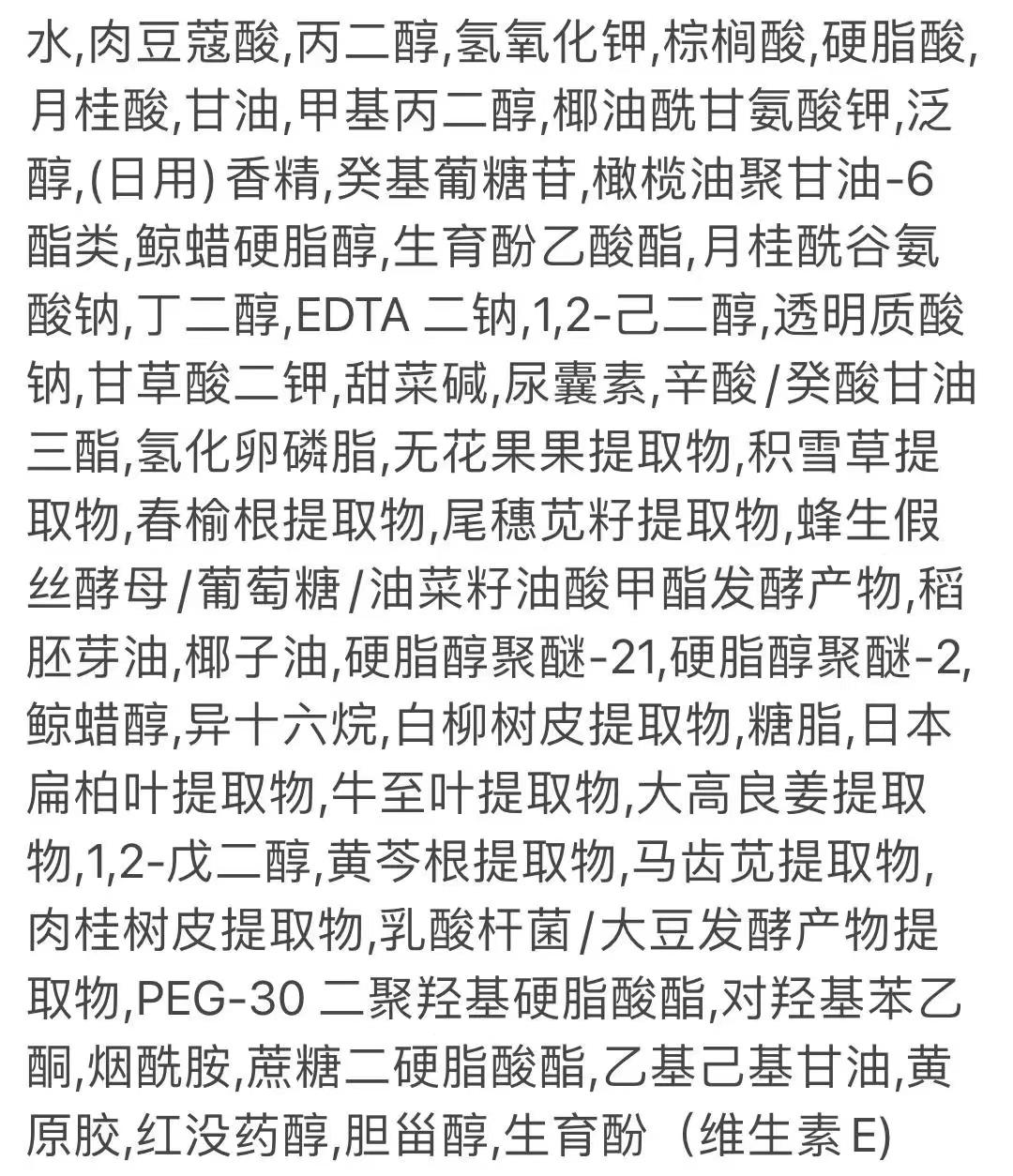 清洁主体是以肉豆蔻酸、棕榈酸、硬脂酸、月桂酸,复配强碱氢氧化钾,构成的皂基体系。排在成分表稍微靠后的,辅助表面活性剂,氨基酸表活,椰油酰甘氨酸钾,APG表活癸基葡糖苷,无色素,有香精的添加,1,2己二醇,对羟基苯乙酮,乙基己基甘油,构成了新型的防腐体系,十多种植物提取物的添加,在洁面产品中并没有什么作用。