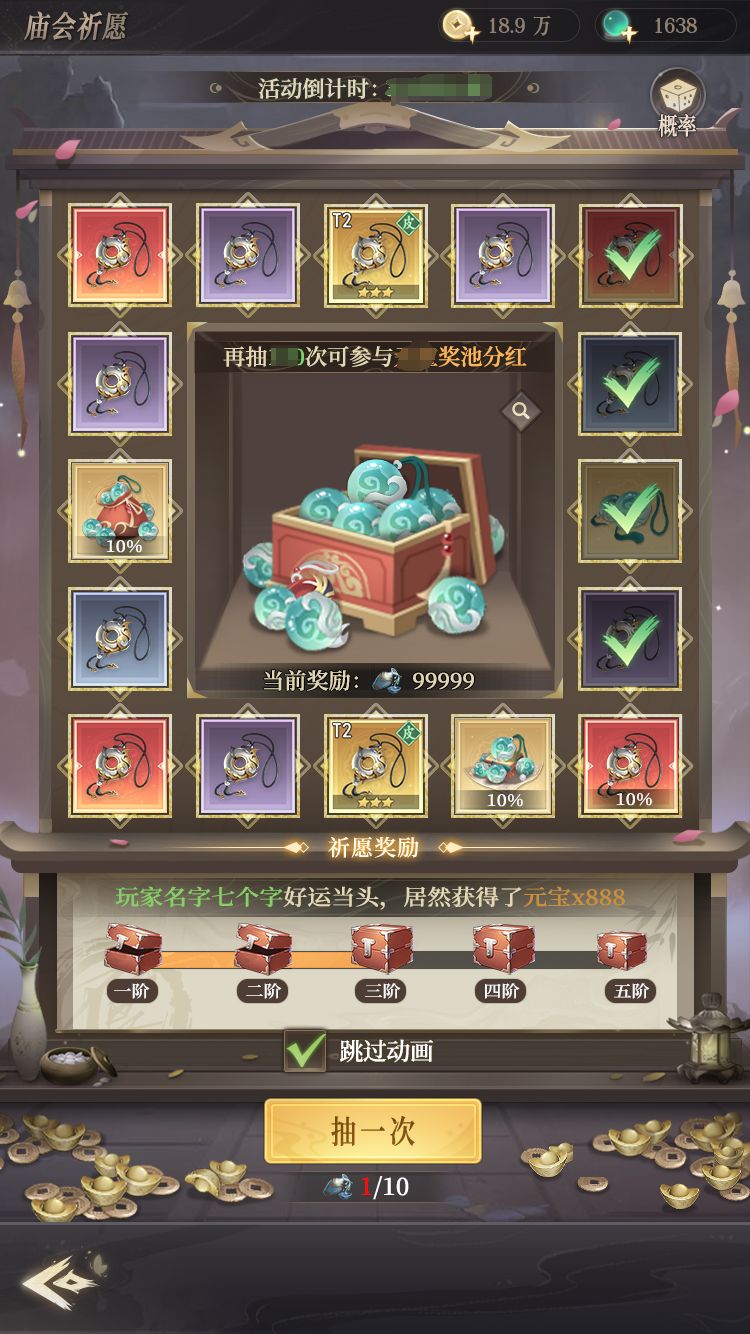 消耗“庙会抽奖券”可在【庙会祈愿】进行抽奖活动累计抽奖达到一定次数
