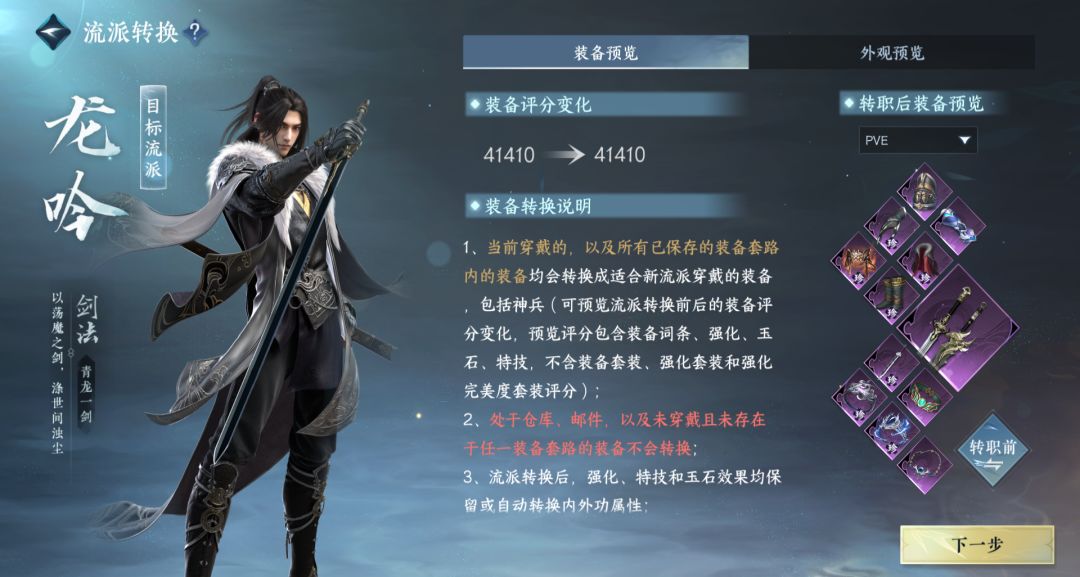 装备预览:转职前,需要把百炼装备全部佩戴在装备套路里,有5个套路,每个里都装备上即可,处于仓库,邮件,未穿戴在套路里的装备不会转换。外观预览:职业外观会转变成龙吟的职业外观。